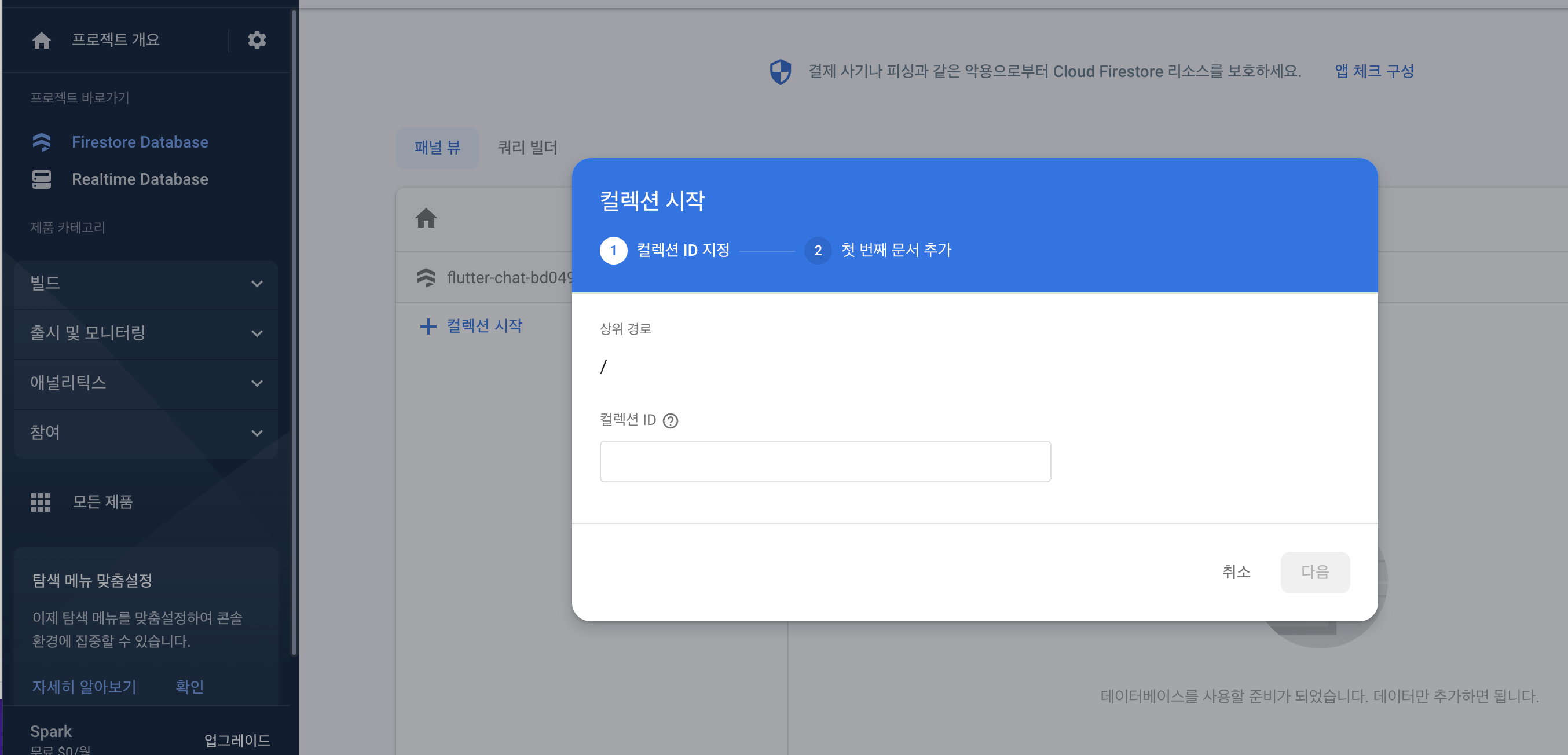2. firebase 페이지에서 cloud firestore 추가